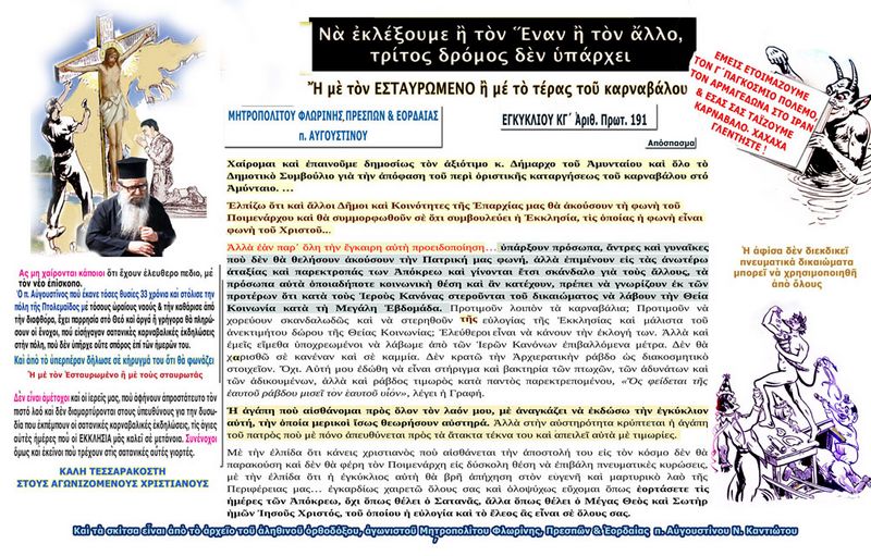 Ή με τον ΕΣΤΑΥΡΩΜΕΝΟ ή με το τέρας του καρναβάλου - του Μητροπολίτου Φλωρίνης, Πρεσπών κ Εορδαίας π. Αυγουστίνου Καντιώτη 22/02/2026 Πηγή: Συντακτική ομάδα PtolemaidaNews.gr