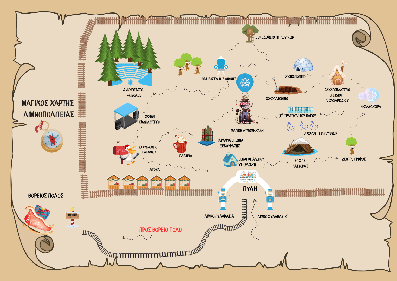 Η «Μαγική Λιμνοπολιτεία» θα λειτουργεί με κυκλική διαδρομή. Παιδιά και οικογένειες θα λαμβάνουν χάρτη και μαγικό πάσο, θα περνούν από σταθμούς δράσεων και θα συλλέγουν σφραγίδες μέχρι να κερδίζουν συμβολική «άδεια ταξιδιού» προς τον Βόρειο Πόλο και το σπίτι του Άγιου Βασίλη. Το θεματικό πάρκο θα περιλαμβάνει λούνα παρκ, χριστουγεννιάτικη αγορά, μόνιμο stage, αμφιθέατρο και τη «Λίμνη των Ευχών», με τα έσοδα να κατευθύνονται στο Γηροκομείο Καστοριάς.